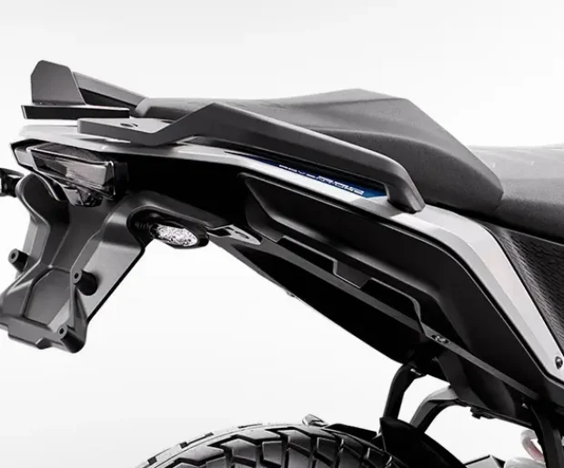 The removable, steel trellis subframe is developed to be compact and lightweight, but strong enough to carry a passenger and luggage, while negotiating the tough conditions that can be expected when adventure riding.